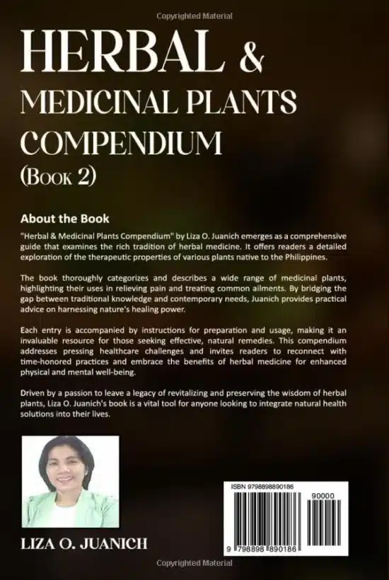 “Herbal & Medicinal Plants Compendium” by Liza O. Juanich is a well-researched guide that delves into the rich tradition of natural healing in the Philippines. The book presents an in-depth look at the therapeutic benefits of native flora used to ease pain and address common health conditions. Juanich thoughtfully bridges traditional wisdom with modern needs, offering practical tips on using plant-based remedies safely and effectively. Each entry includes clear preparation methods and usage guidelines, making it a valuable reference for those interested in natural wellness. By addressing key health concerns with time-tested approaches, the compendium encourages readers to rediscover the value of nature’s pharmacy. With a vision to preserve cultural knowledge and promote holistic well-being, Juanich delivers a resource that inspires a return to sustainable and effective health practices.”